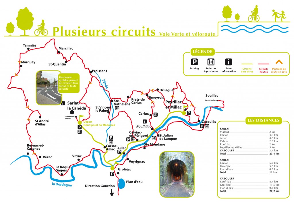 Depuis Sarlat, haut lieu du tourisme en Périgord noir, remontez la Vallée de la Dordogne jusqu’à Groléjac ou Cazoulès aux portes du Quercy. voir une vidéo sur la voie verte de Sarlat.