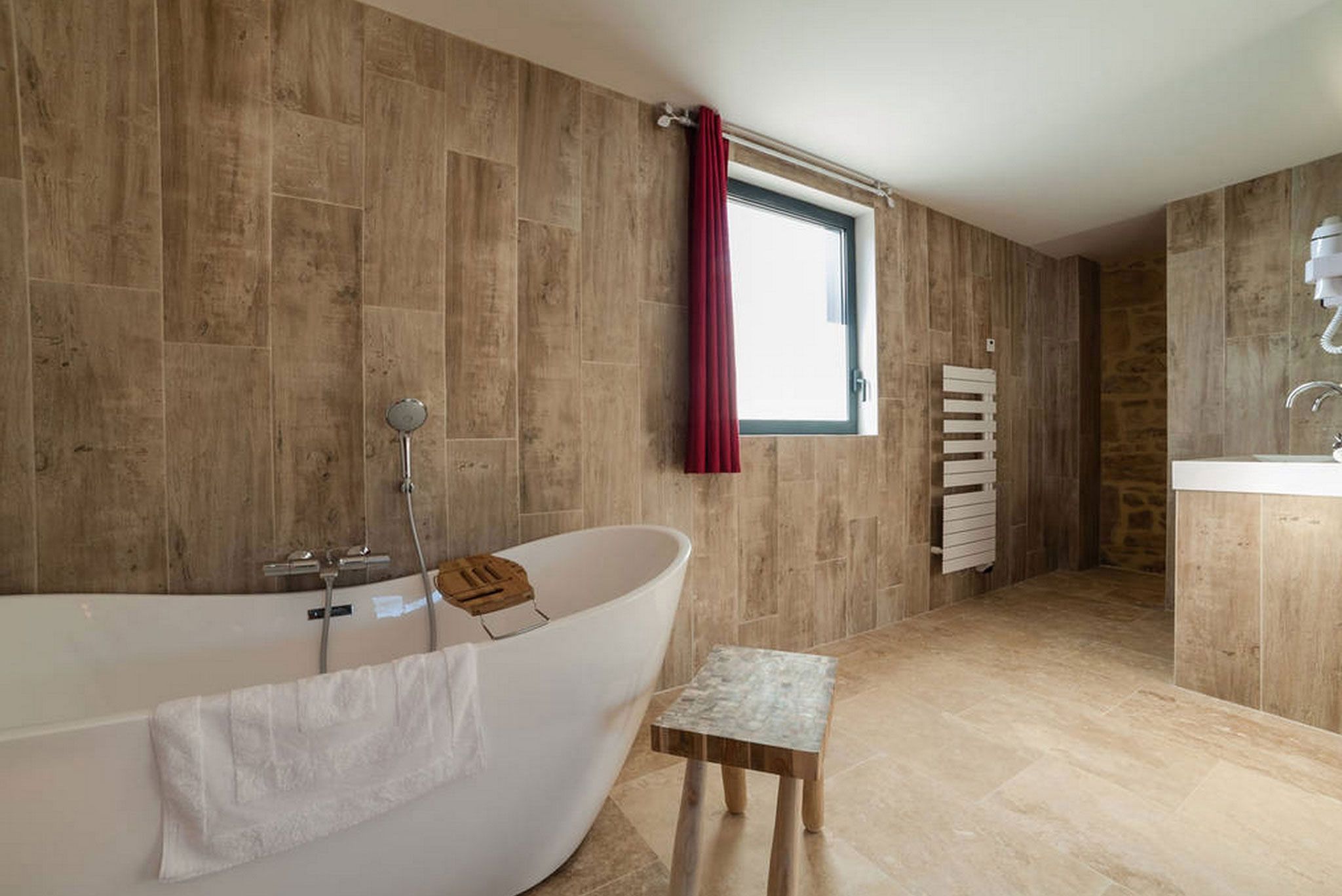 La salle de bains dispose d’une baignoire îlot et d’une douche Italienne, d’une double vasque, d’un sèche-cheveux et d’un sèche-serviettes.