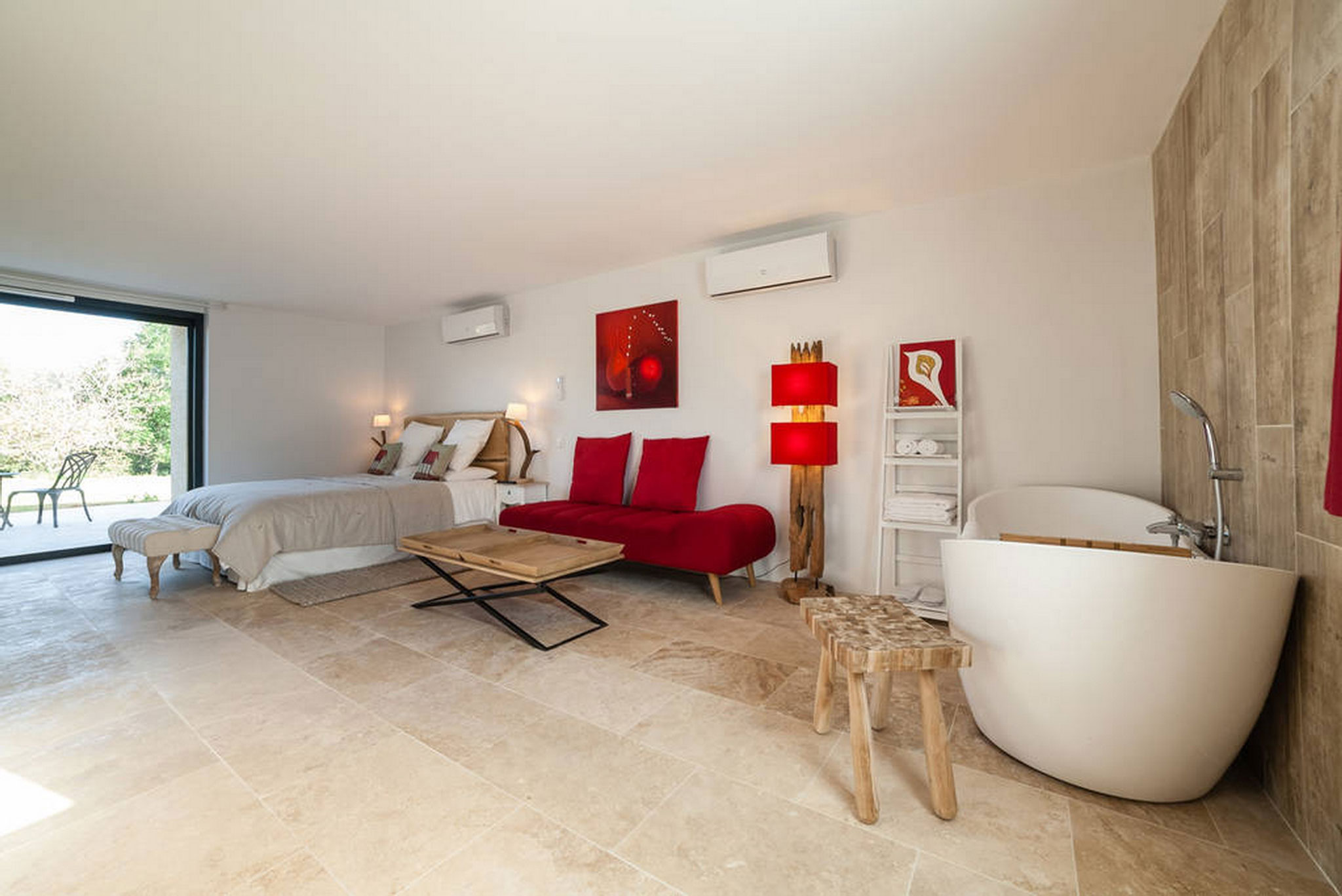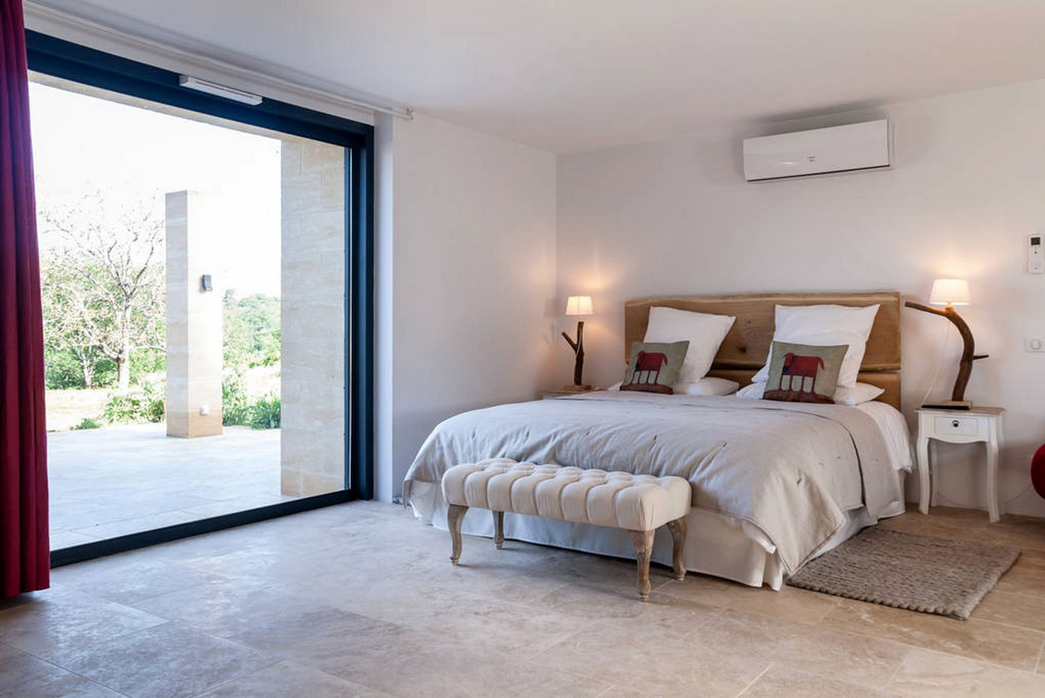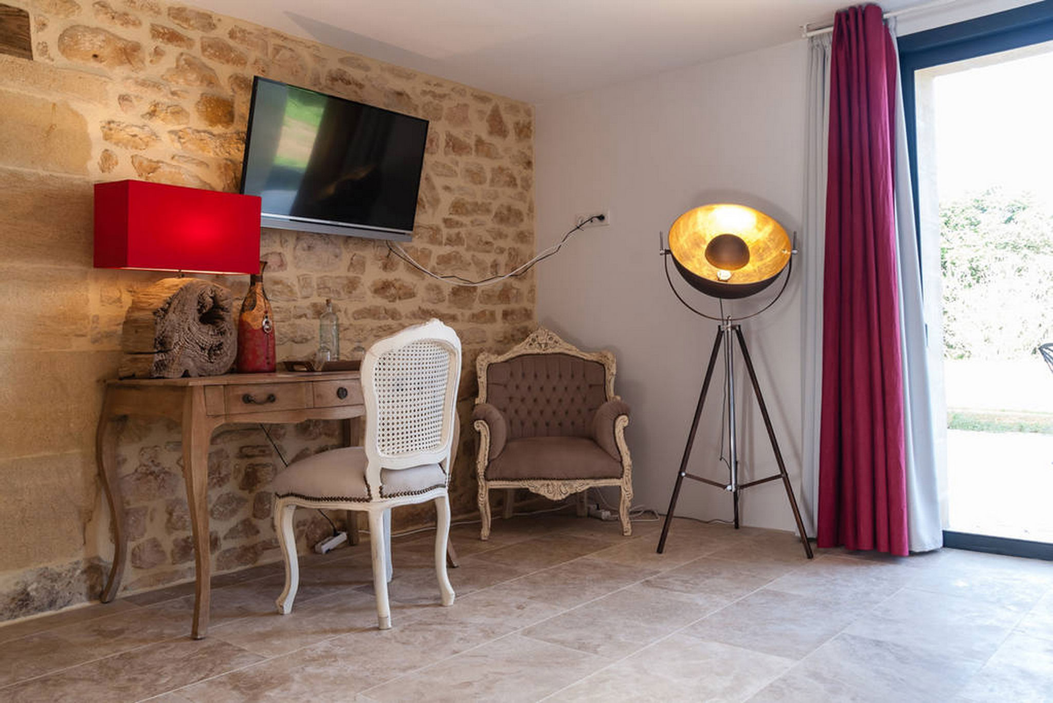 La chambre Domme confortable et luxueuse en rez-de-jardin est climatisée, sa terrasse privative à l’ouest donne sur les champs et la forêt alentour.
